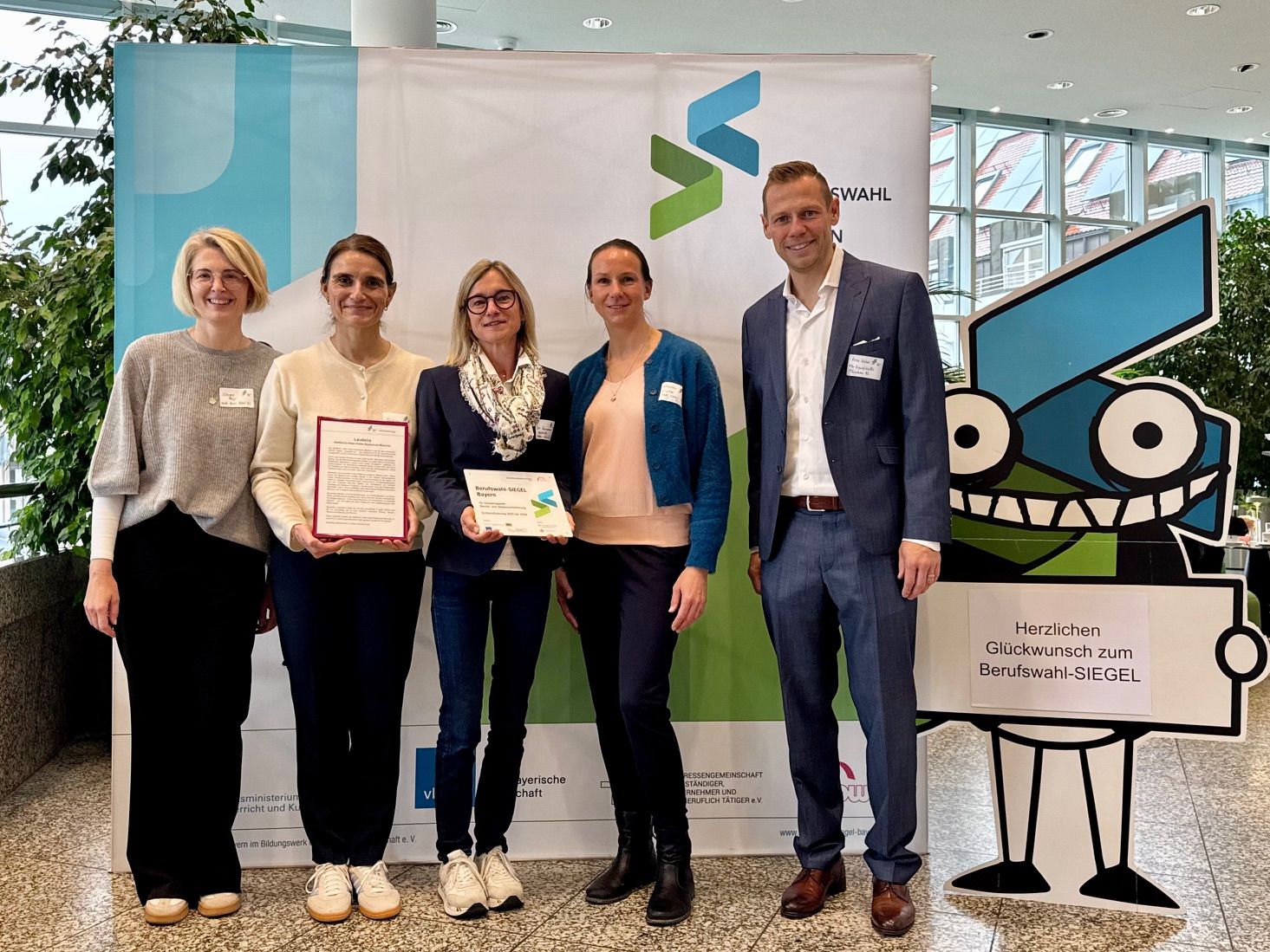 Frau Mayr (Stellvertretende Schulleiterin), Frau Saliji (Mitglied der Erweiterten Schulleitung und Koordinatorin für Berufliche Orientierung), Frau Zimmermann (Schulleiterin), Frau Schuster (Fachschaftsleiterin Wirtschaftswissenschaften) und Herr Weber (BerR und Mitarbeiter der MB-Dienststelle München) bei der feierlichen Übergabe des Siegels in der Stadthalle Gersthofen.